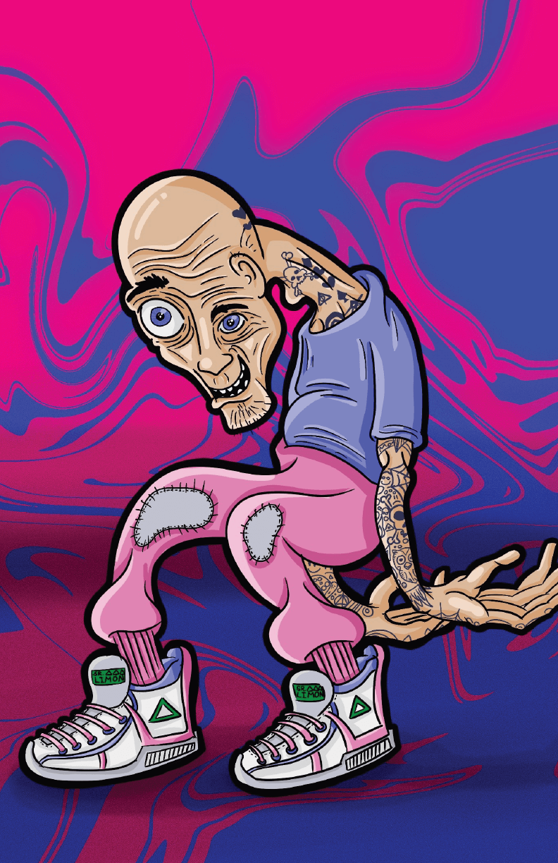 Este print nos muestra a un personaje único con una pose despreocupada, vistiendo pantalones desgastados y unas zapatillas deportivas personalizadas que gritan “Sr Limón”. Con tatuajes que cubren su brazo y una expresión intrigante, este personaje parece disfrutar de su propia compañía en un fondo psicodélico de tonos vibrantes. Ideal para quienes disfrutan del arte alternativo y urbano, este print es una combinación perfecta de estilo callejero y surrealismo visual.