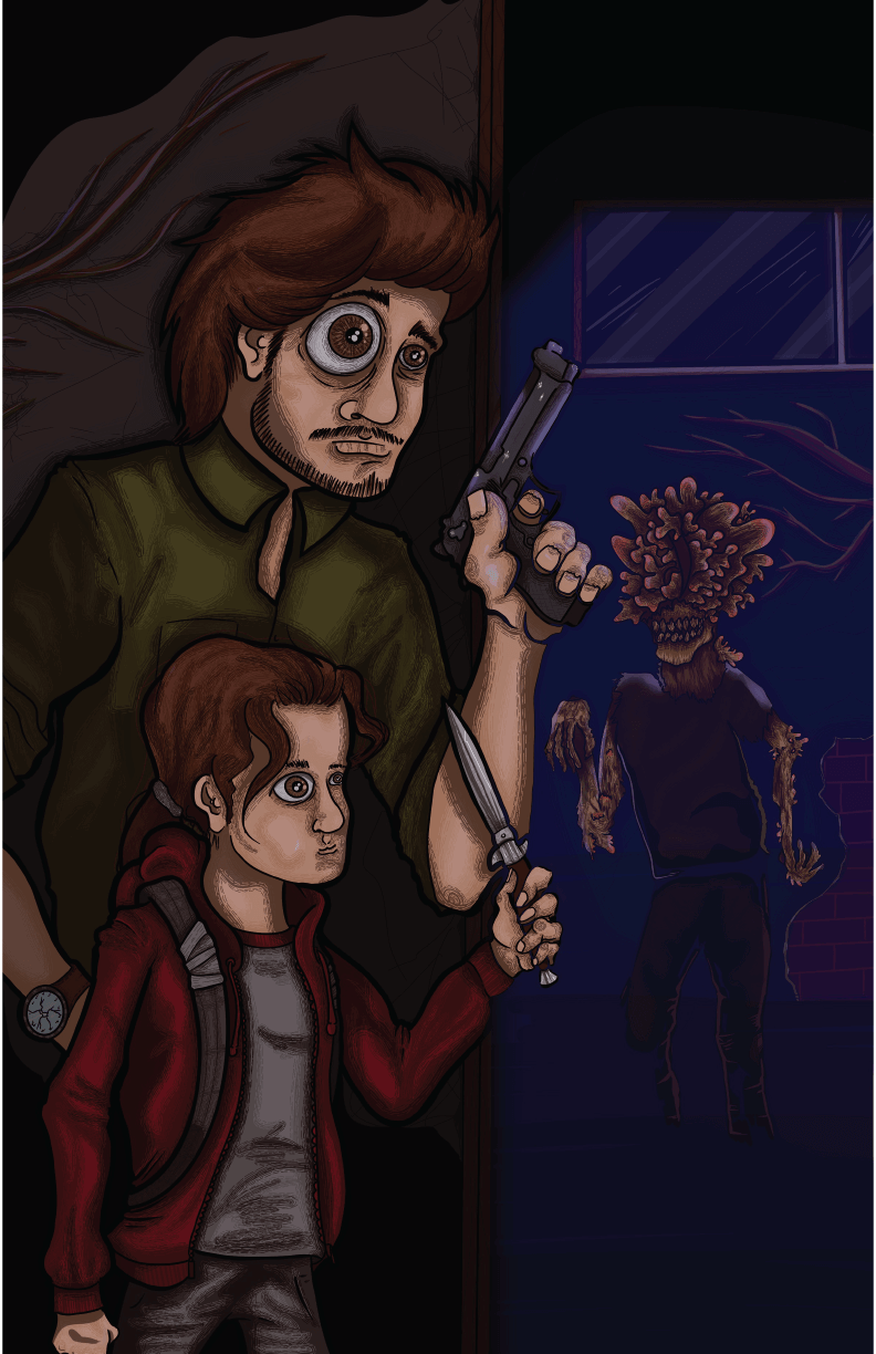 Este print captura la tensión y el peligro de un mundo postapocalíptico, inspirado en The Last of Us. Los dos protagonistas, armados con una pistola y un cuchillo, se preparan para enfrentar a una aterradora criatura infectada al fondo. Las expresiones de miedo y determinación reflejan la lucha constante por la supervivencia. Con un estilo visual que combina lo crudo y lo satírico, este print es perfecto para los fanáticos del videojuego y de las historias de supervivencia en un mundo dominado por el miedo y el peligro.